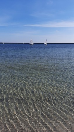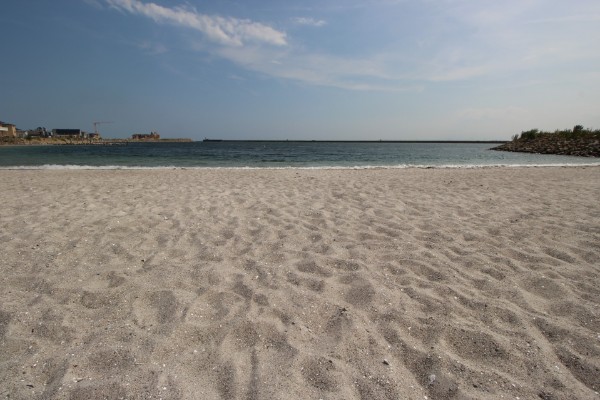 Ostseestrand am Strandhaus Libelle, geschützt durch die Molen des Hafens.
